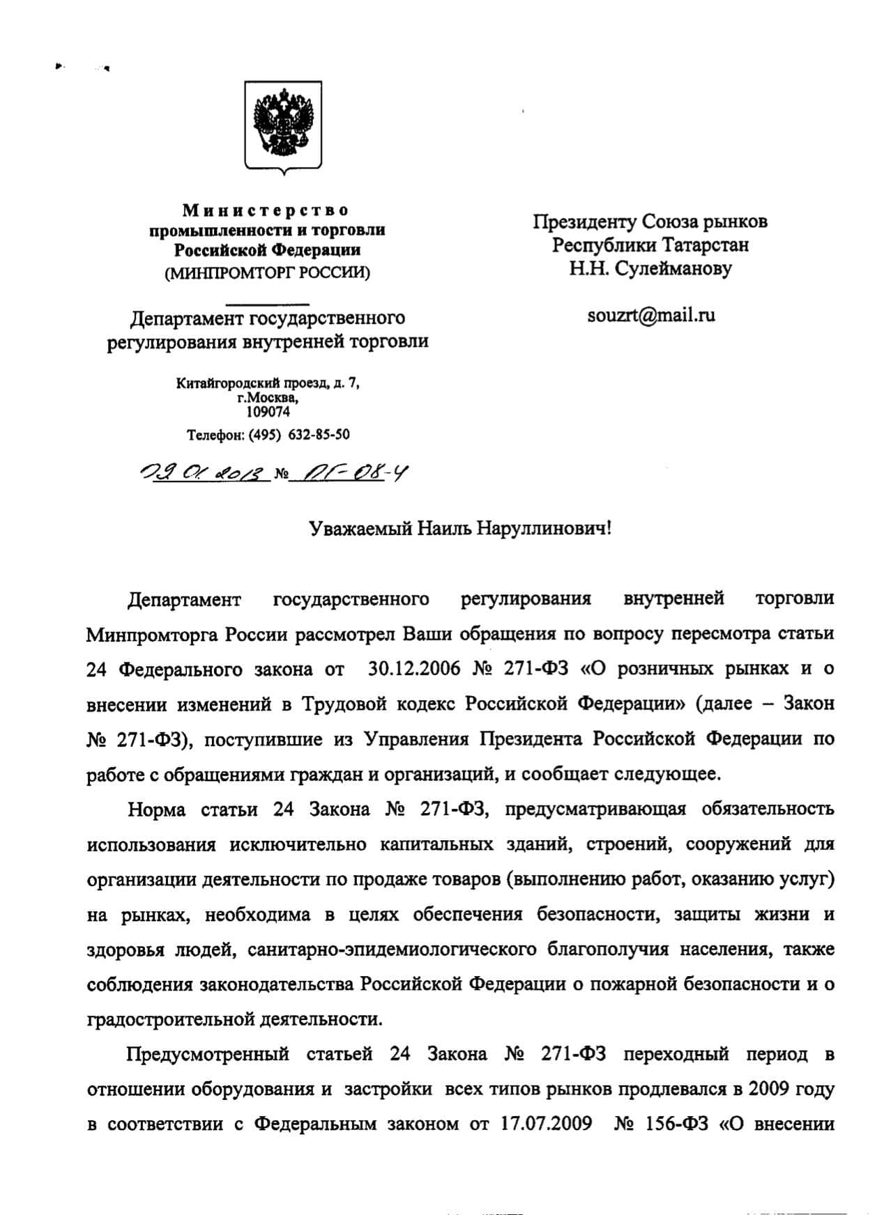 Ответ из Минпромторга РФ на обращение президента Союза Рынков РТ Наиля Сулейманова
